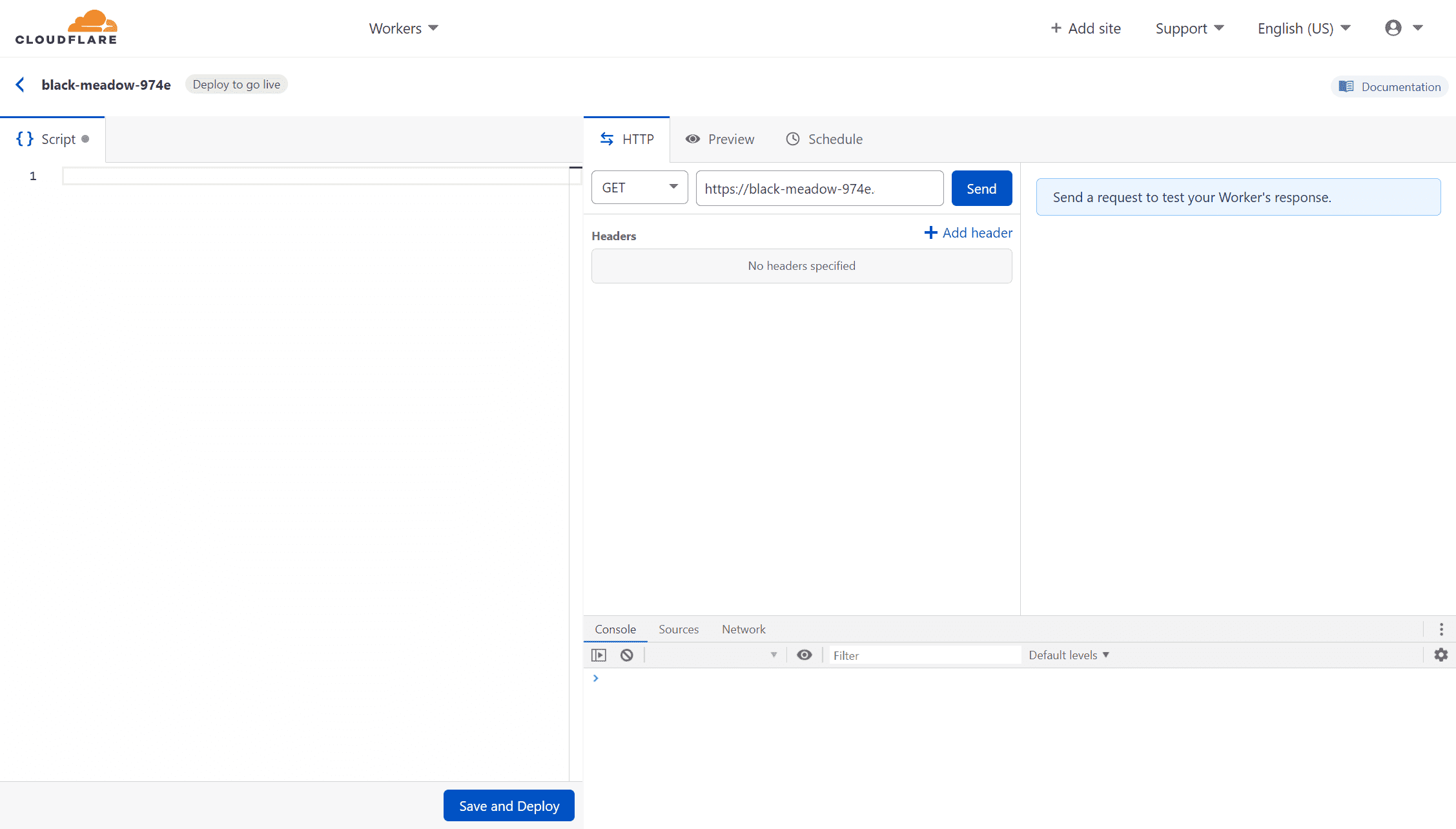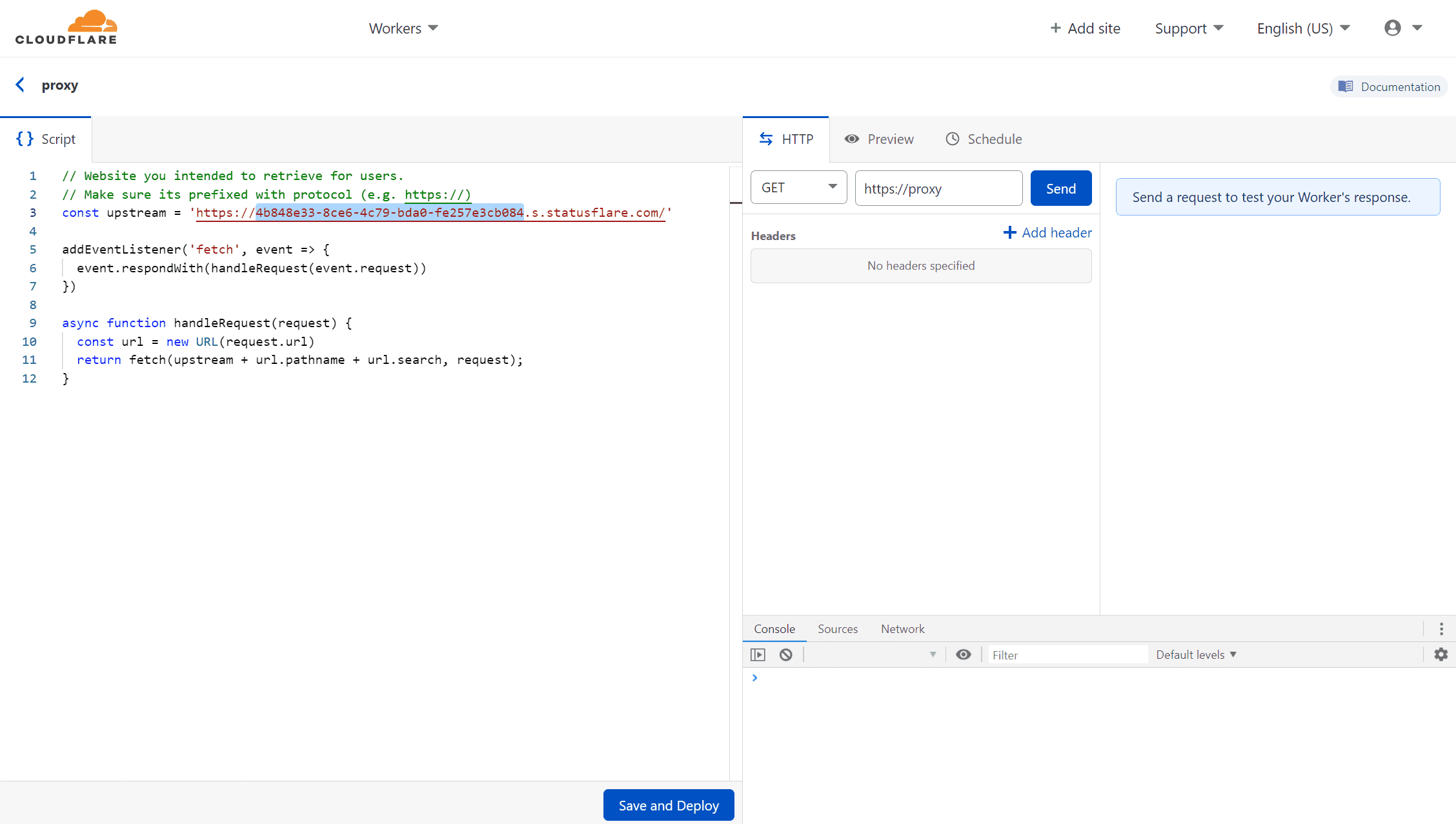 async function handleRequest(request) { const url = new URL(request.url) return fetch(upstream + url.pathname + url.search, request);}Next press "Save and Deploy"